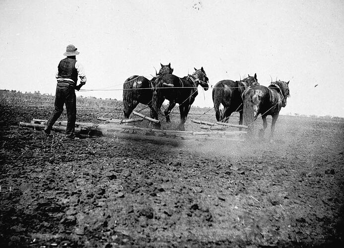 Agricultural Equipment, Agricultural Workers, Farms, Harrows, Horses
