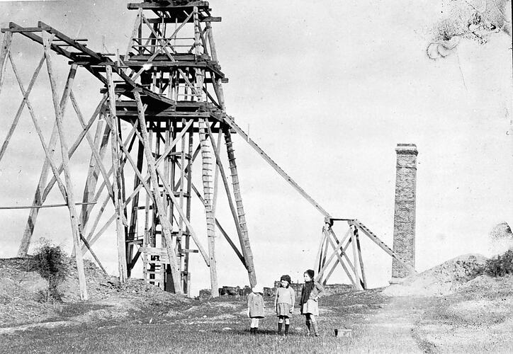 Children in front of mine. There is a poppet head immediately behind them and a chimney in the distance.
