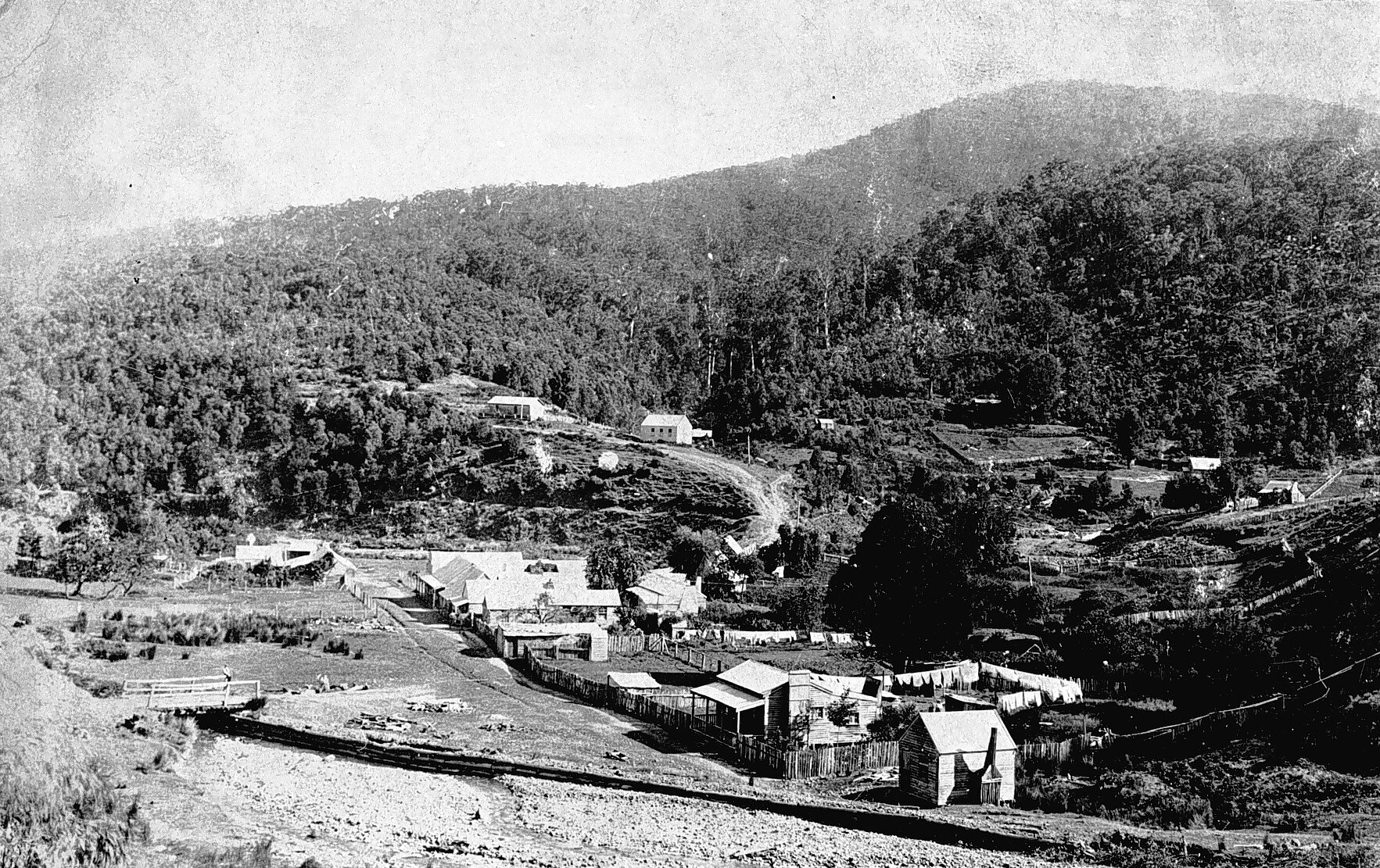 Jericho township. From the right: butcher 's shop, J. Rae's house, Rae's Hotel, Moore's Hotel, Bennett's House. The Roman Catholic Church and the courthouse are on the hill in the background.