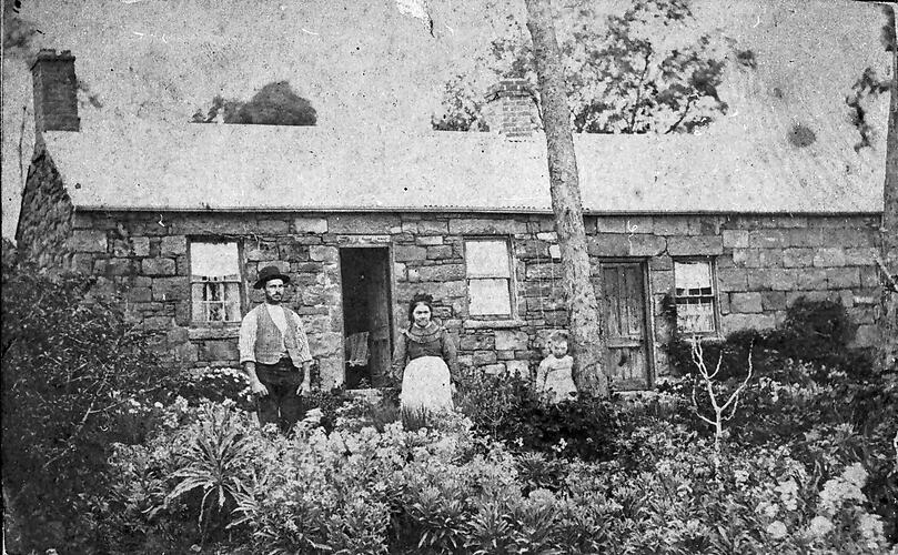 Black and white photograph of a man, woman and child in front of a stone cottage in Clarke Street, Harveytown, also now known as Eaglehawk, near Bendigo in the goldfields area of Victoria, circa 1885. It is unclear who the family is but it is possible that it is Eliza and Thomas Harvey, Cornish immigrants who built the cottage.