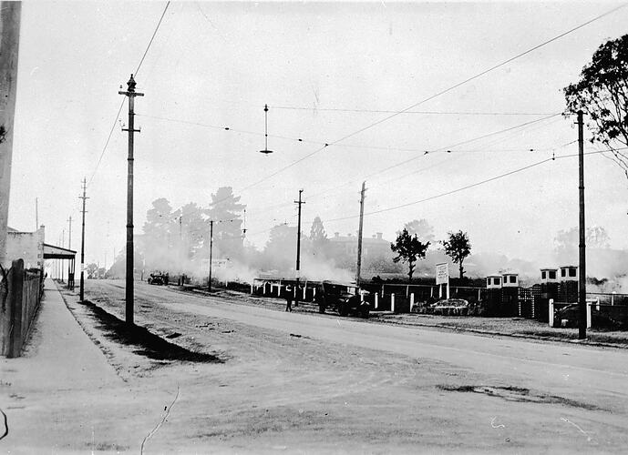 Image looking down an unsealed road with footpath and fencing on the left side and a building with a verandah. The left foreground shows a a street turning off to the left. At right in the foreground are the gates of a park, and at right background is smoke from a 'burning off' fire on the right side of the road. There are tram tracks down the middle of the road. Two cars are parked along the right hand side of the road with some people nearby. Trees line the side of the road, and a large house is visible in far right background. A sign on the right of the road says 'De Mont ???'