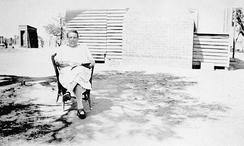 Woman seated outside home. There is an outside toilet in the background.