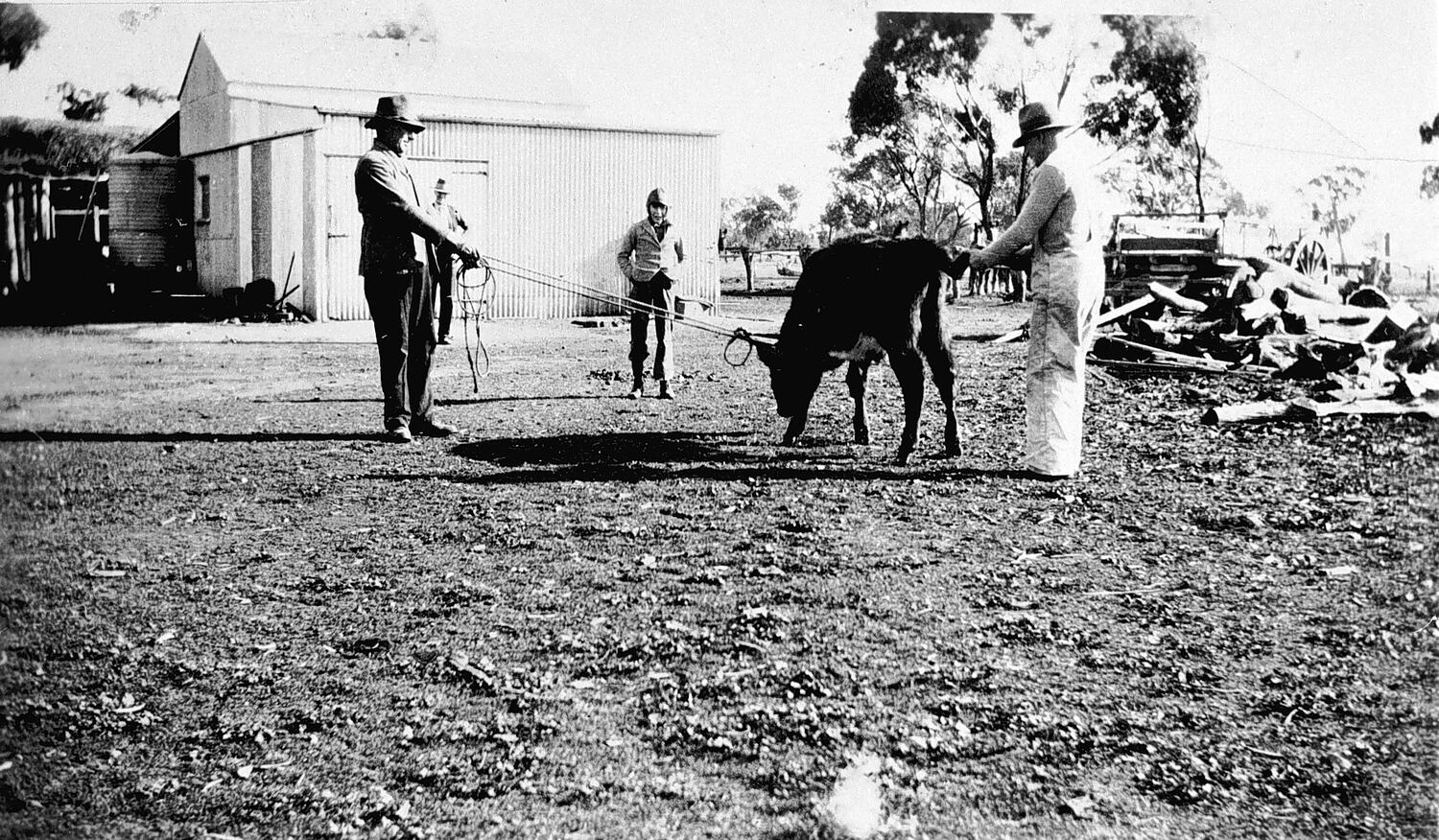 Men branding a calf. The corrugated iron shed in the background was used as living quarters until the Soldier Settlement home was built.