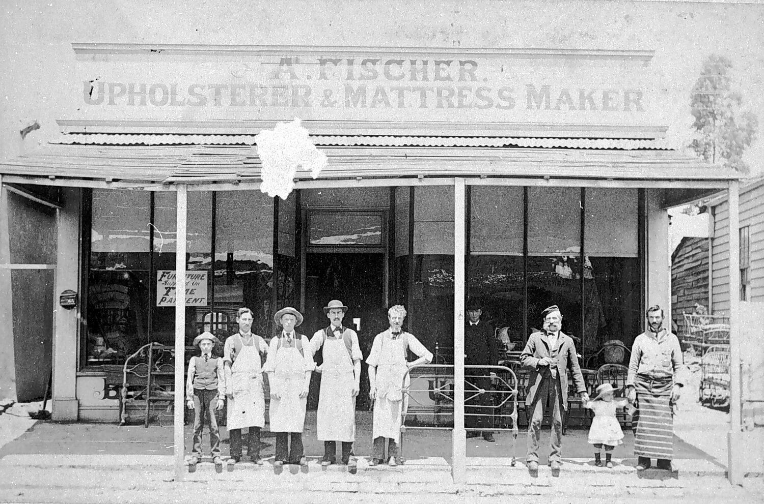 Staff outside shop of A. Fischer, Upholsterer & Mattress Maker.
