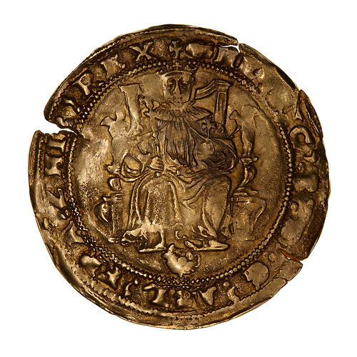Edward VI enthroned facing holding a sword and orb; below, tudor rose partly removed from die; around, (mm removed on die) HENRIC 8 D G AGL FRA Z HIB REX