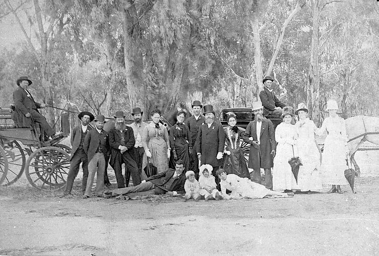 A group of people on a picnic at the junction of rivers (Murray and Campaspe) at Echuca.