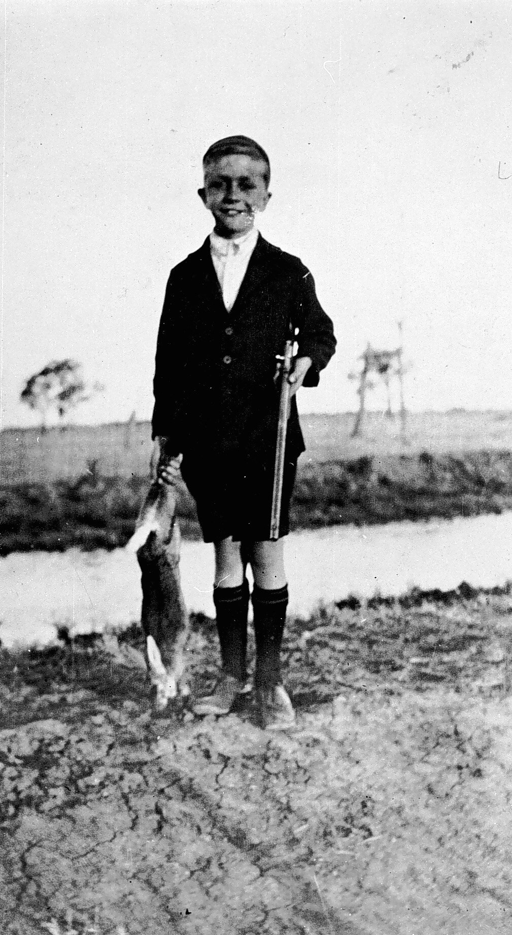 A boy with a rabbit and a gun. There is an irrigation channel behind him.