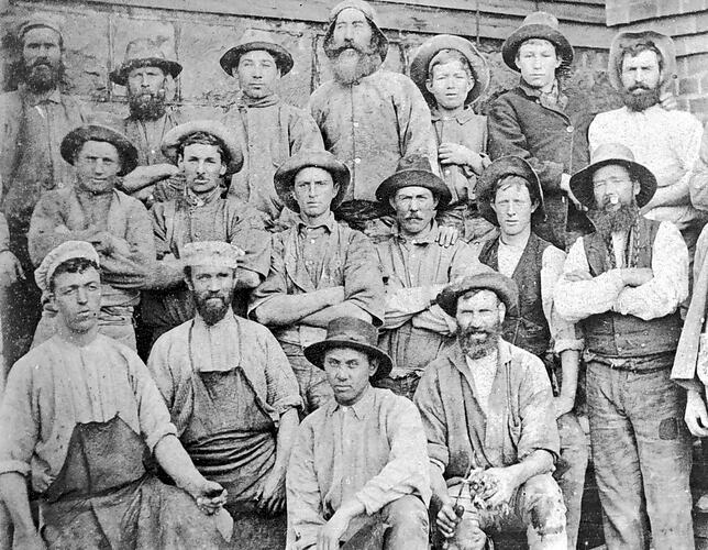 Photograph of a group of workmen, probably miners, possibly in the Creswick District of central Victoria, around 1880.
