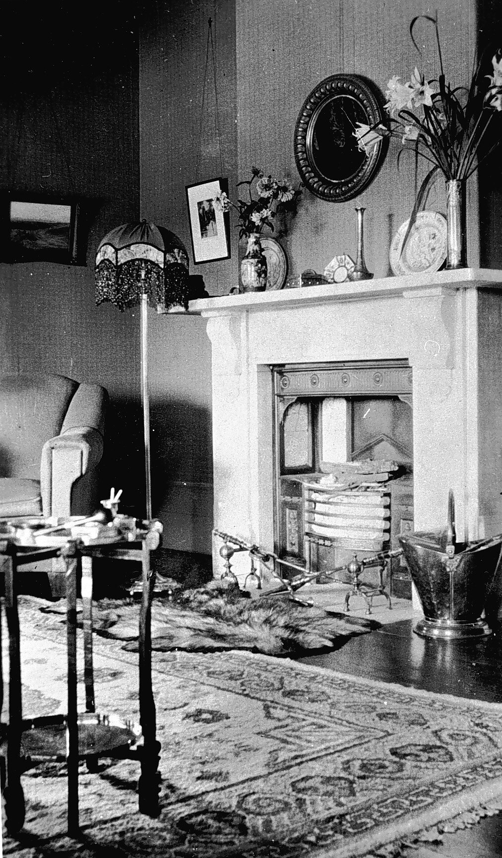 A lounge room. There is a fireplace with a coal scuttle and fire irons, a table, a lamp and an easy chair.