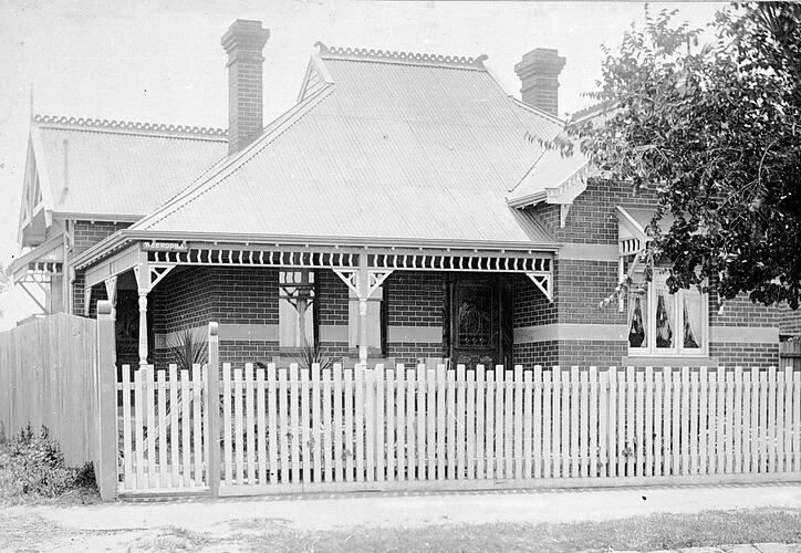 A brick house, 'Weeroona', with a verandah and a picket fence.
