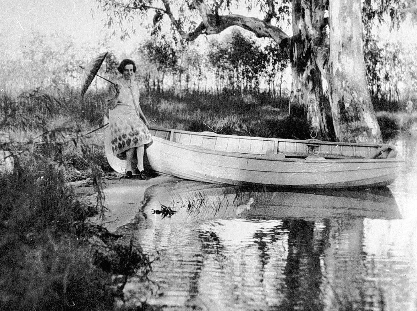 A woman with a parasol seated on a rowing boat drawn up on the sand at the edge of the lake.
