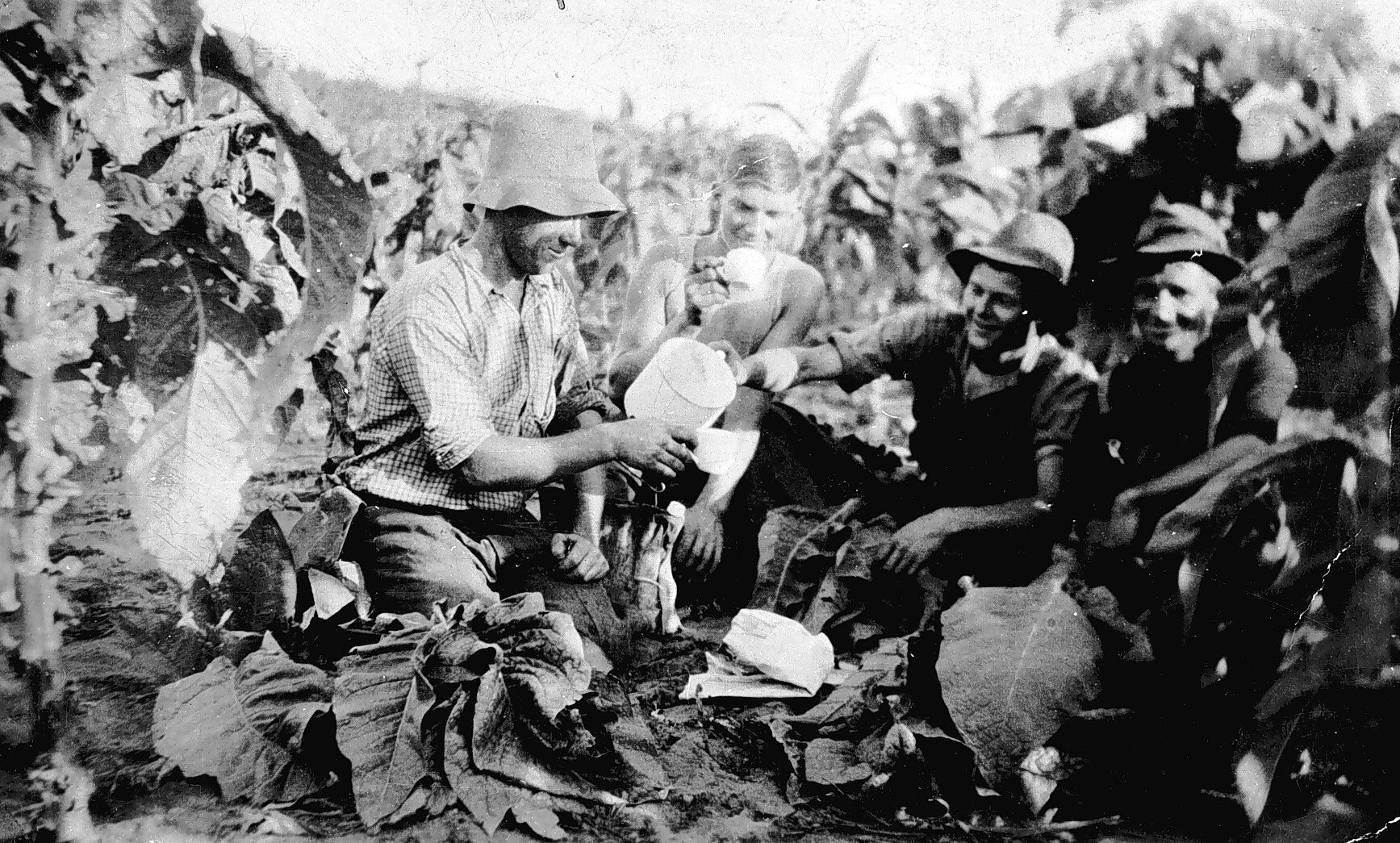 Tobacco workers having a tea break on 'Clancolla' farm.
