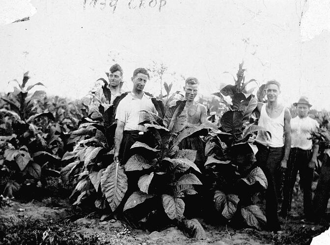 Men standing in a tobacco crop on 'Clancolla' farm.