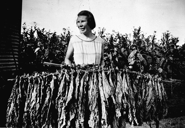 A woman holding dried tobacco leaves on 'Clancolla' farm.
