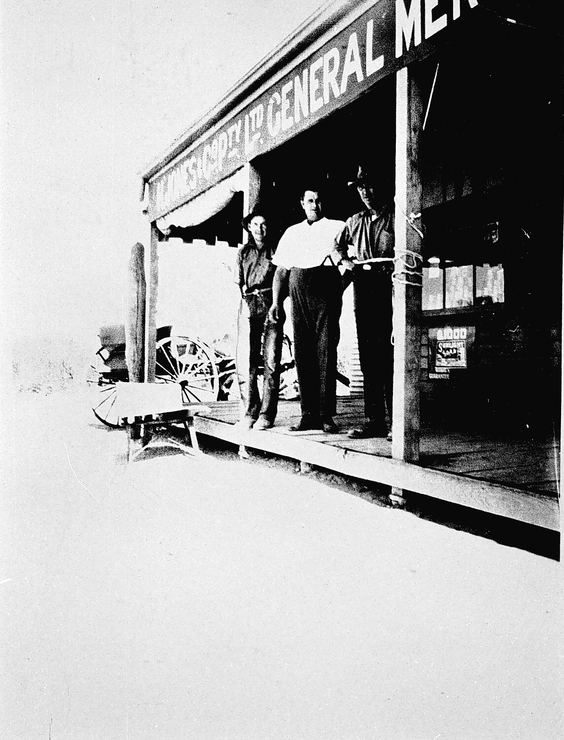 Three men standing on the verandah of K. Jones Company Proprietary Limited General Merchant.