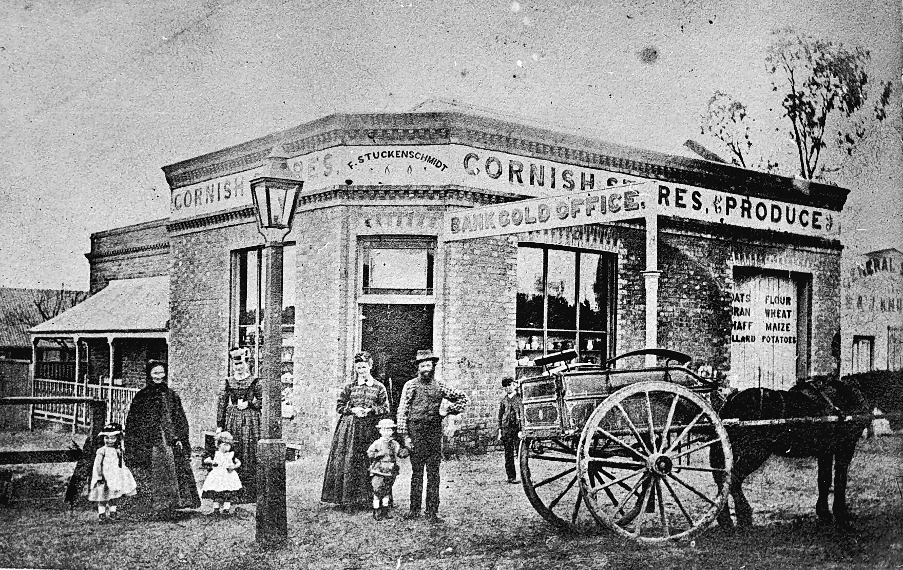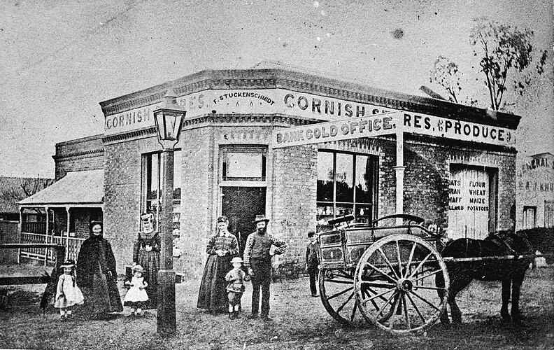 F. Stuckenschmidt and his family in front of his shop, the 'Cornish Stores'. A street sign in front of the shop reads'Bank Gold Office' and there is a gas lamp on the corner. The store is a brick building with a residence attached to the side. The women are dressed in crinolines and there is a horse and buggy outside the store.