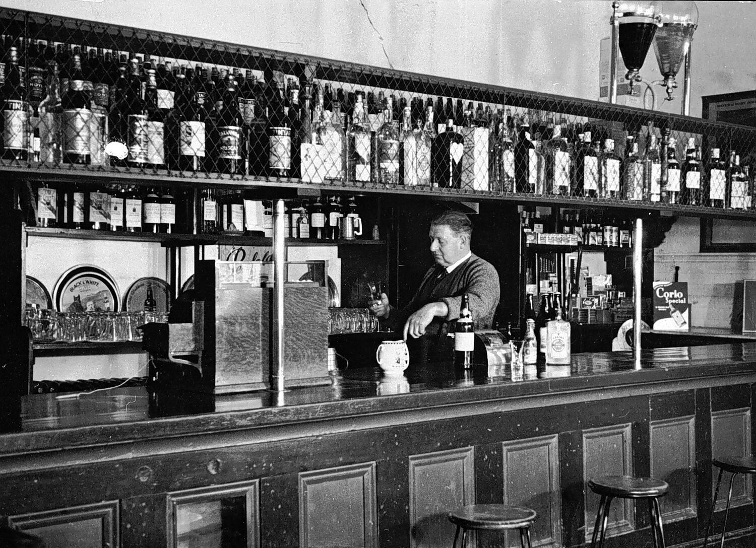 The hotel proprietor behind the bar in the traveller 's lounge in Merritt's Park Hotel.