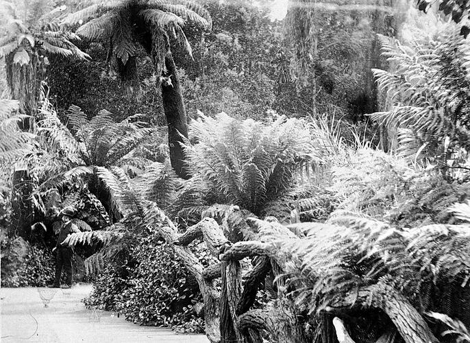 Fernery in Rosalind Park. The path is bordered by a rustic fence.