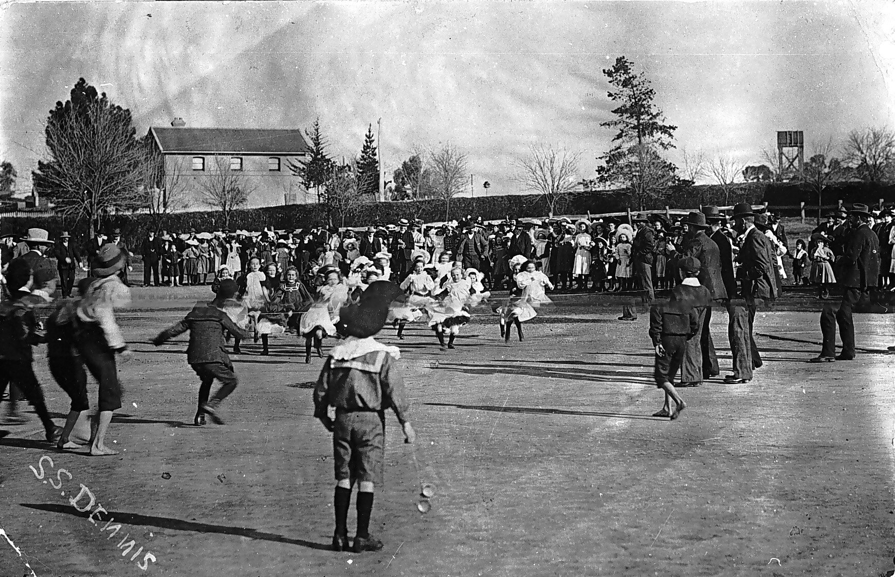 Children performing a dance in the market square. The Wedderburn court house is in the background.