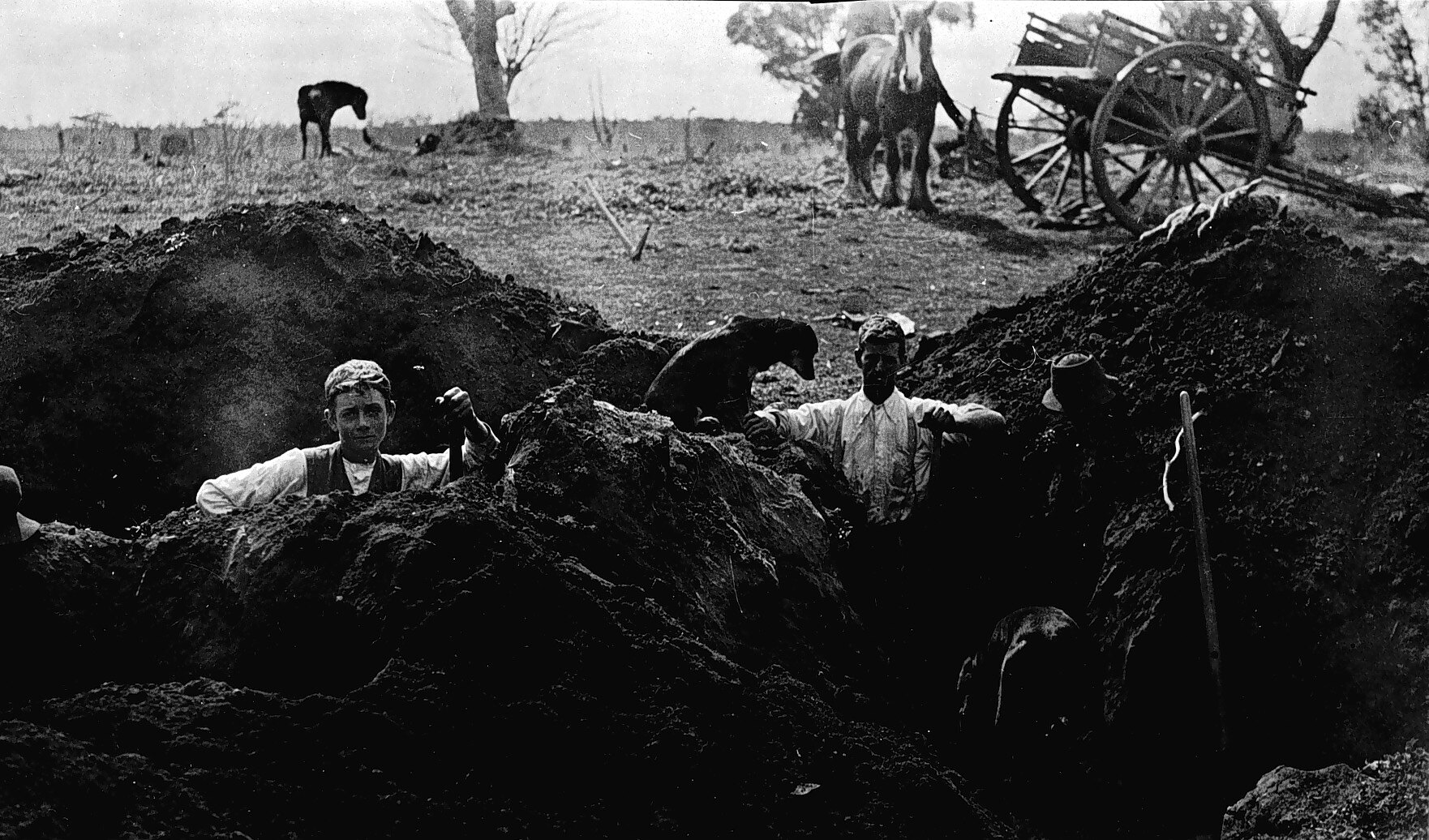 Two men digging holes. There is a cart in the background and two horses grazing. A dog sits beside one of the holes.