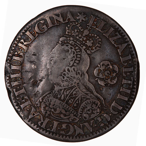 Crowned bust of the Queen, wearing ruff and embroidered dress facing left; behind, rose; around, (mm. star) ELIZABETH D G ANG FRA ET HIB REGINA