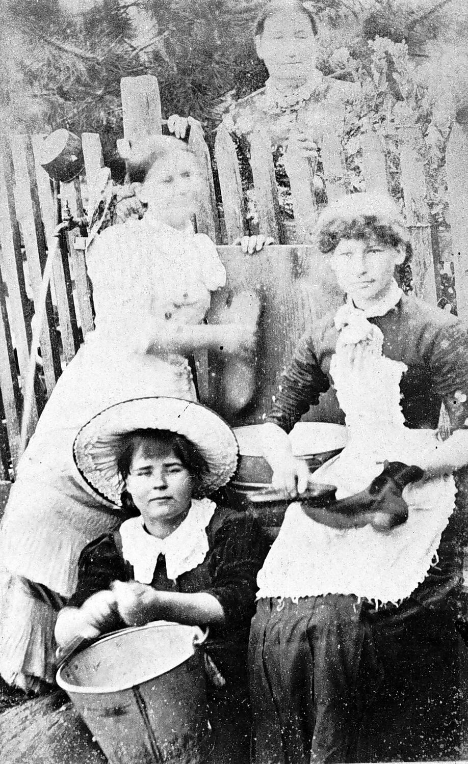 Madam Strachan and her three maids. Madam Strachan stands behind the fence, one maid is cleaning a boot, one is peeling potatoes while the third stands behind them with a scrubbing brush.