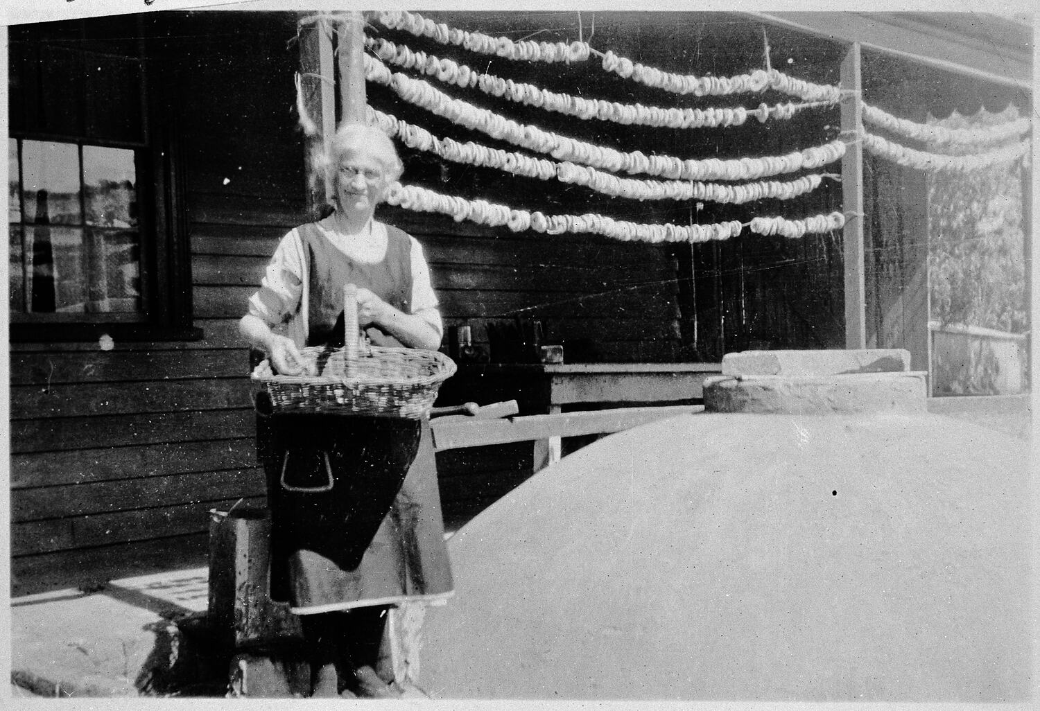 A woman, Christina Park, drying apples. The apples have been cored and are hung on lines strung on a verandah. There is a domed structure to her left.