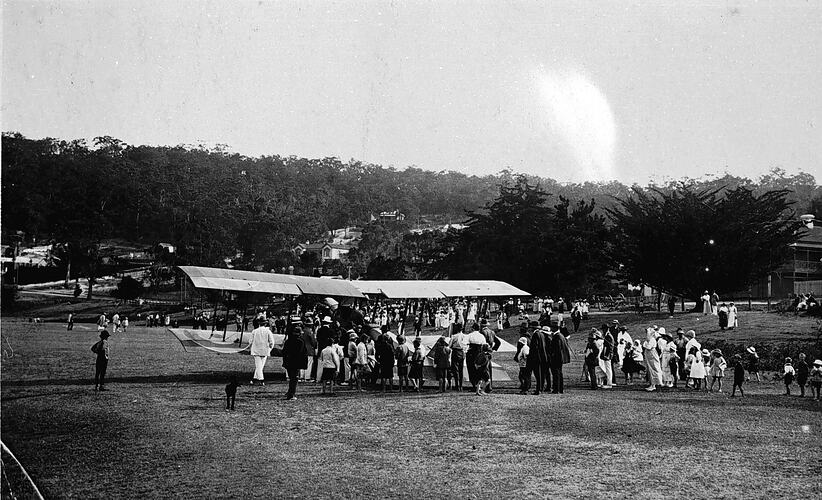 A group of people gathered around a biplane, the first aircraft to land at Lorne.