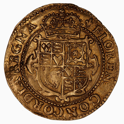 At centre within a circle of beads, crowned and garnished shield quartered with the arms of England and Frace jointly in 1st and 4th, Scotland and Ireland; around, (mm. lis) FLORENT CONCORDIA REGNA (translation: United kingdoms flourish)