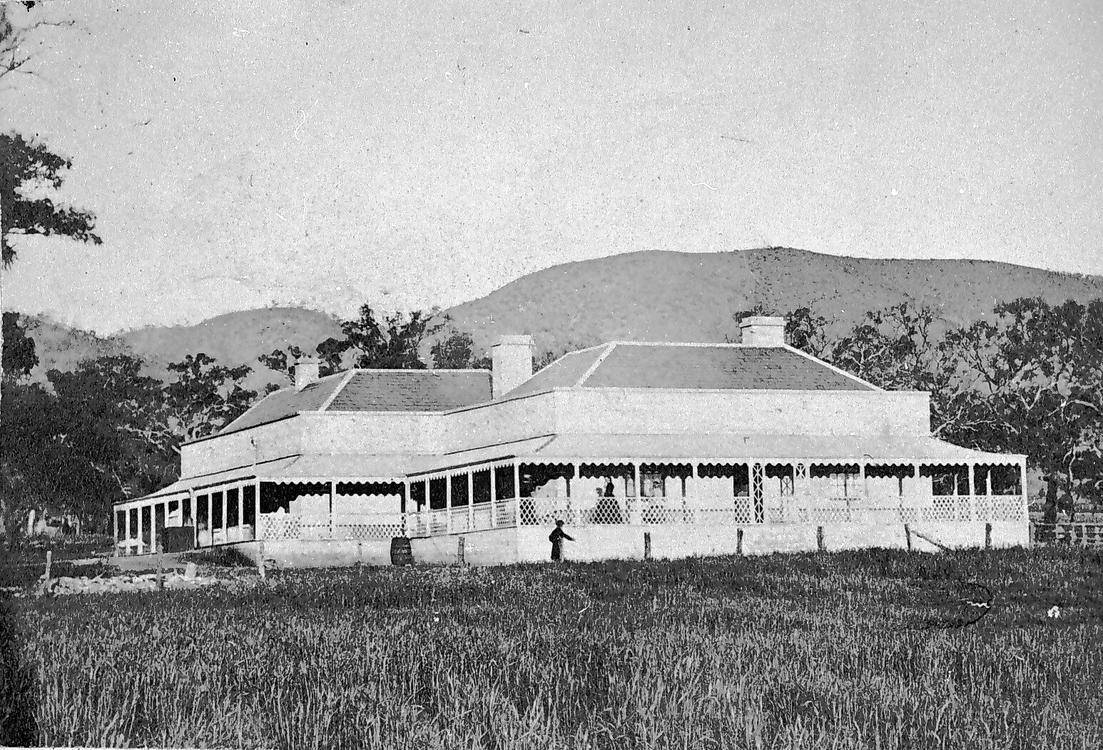 A woman on the verandah of a homestead. A man is standing by the fence.
