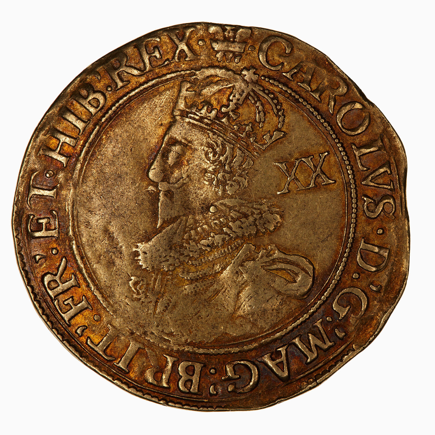 Within beaded circle crowned bust of Charles I wearing a ruff, armour and mantle fastened on shoulder; behind, XX; around, (mm. plume) CAROLVS D G MAG BRIT FR ET HIB REX