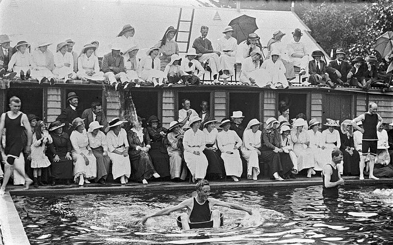Two men in the swimming pool at 'Erskine House'. A large group of people are seated at the side of the pool and on top of the dressing shed.