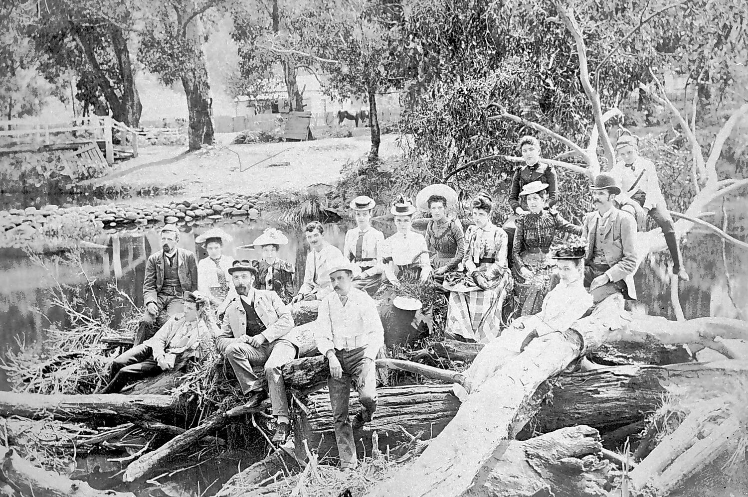 A group of men and women by the river near 'Erskine House', Lorne.