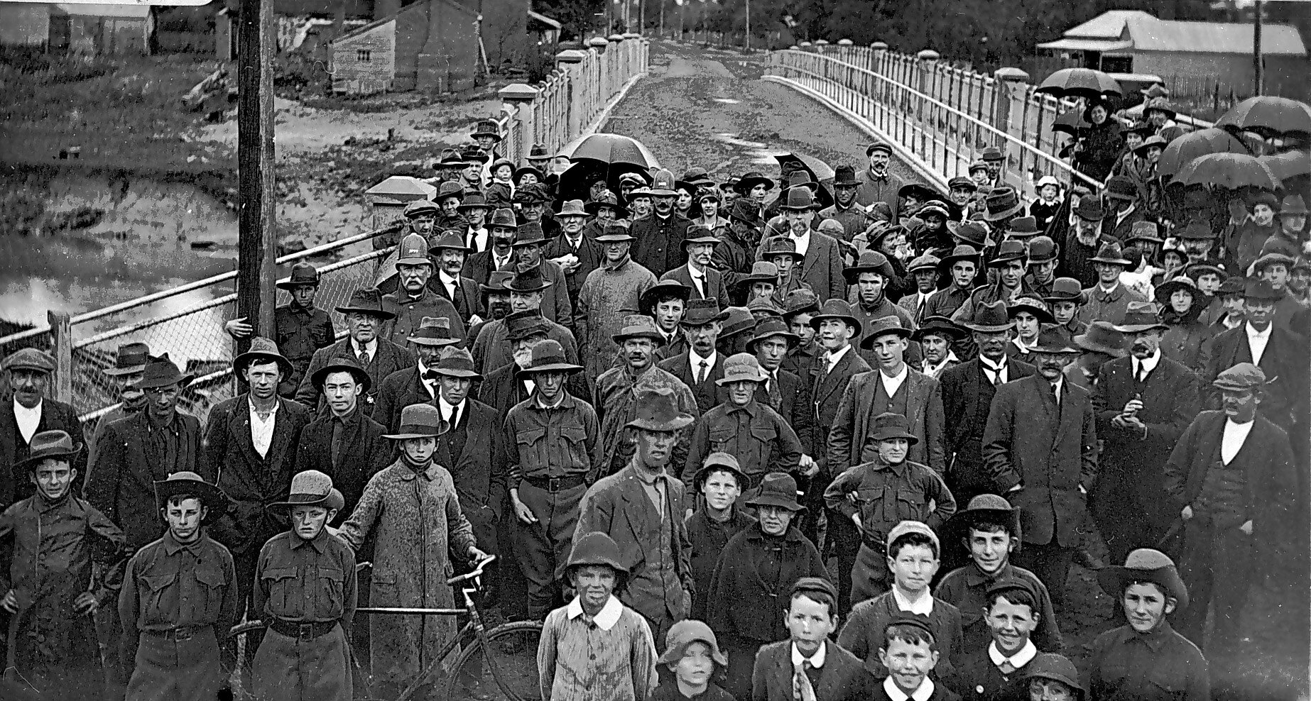 The opening of the new bridge over the Campaspe River. Sharpe's Bakery is on the right and the flour mills on the left.