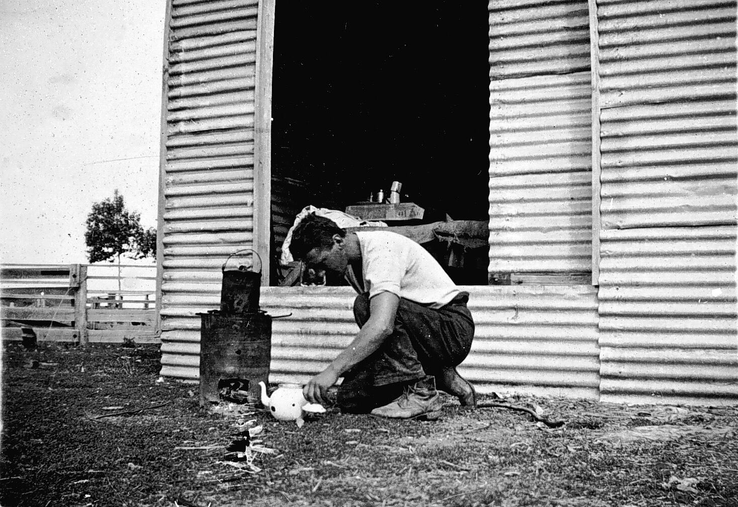 Shearer making a pot of tea in front of a woolshed where he was camping.