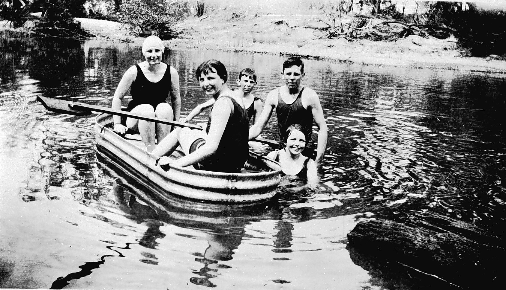 The Ramsay family and friend Flora in a corrugated iron row boat on the Loddon River. Three of the children are in the water beside the boat.
