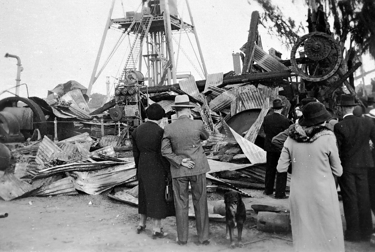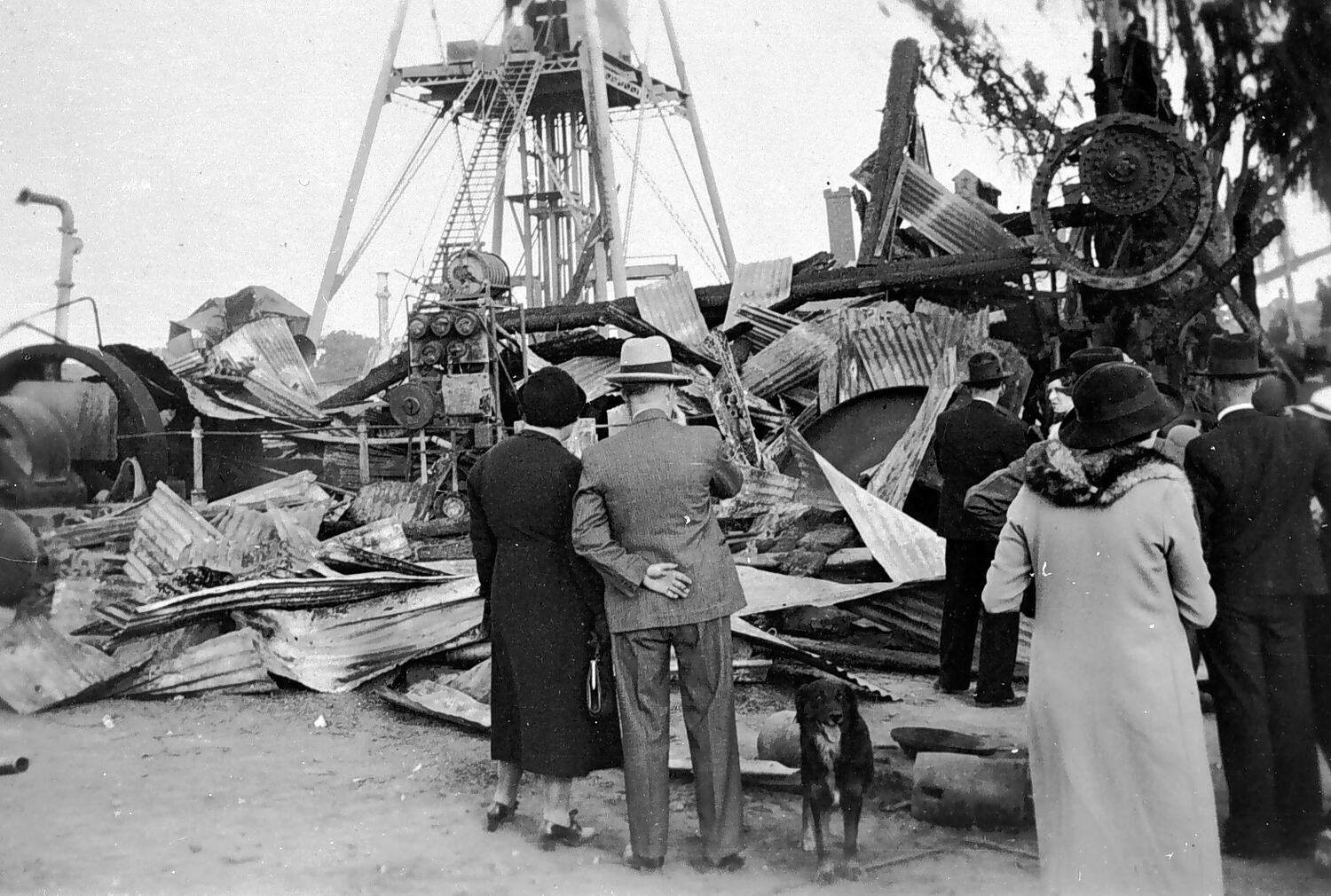 People inspecting ruins of the surface mining plant at the New Red, White & Blue Consolidated Co. N.L. mine, near Quartz Hill at South Bendigo, following a disastrous fire on the night of Friday 13th May 1938. The steel-frame poppet head, which appears to be undamaged, remains standing in the background.