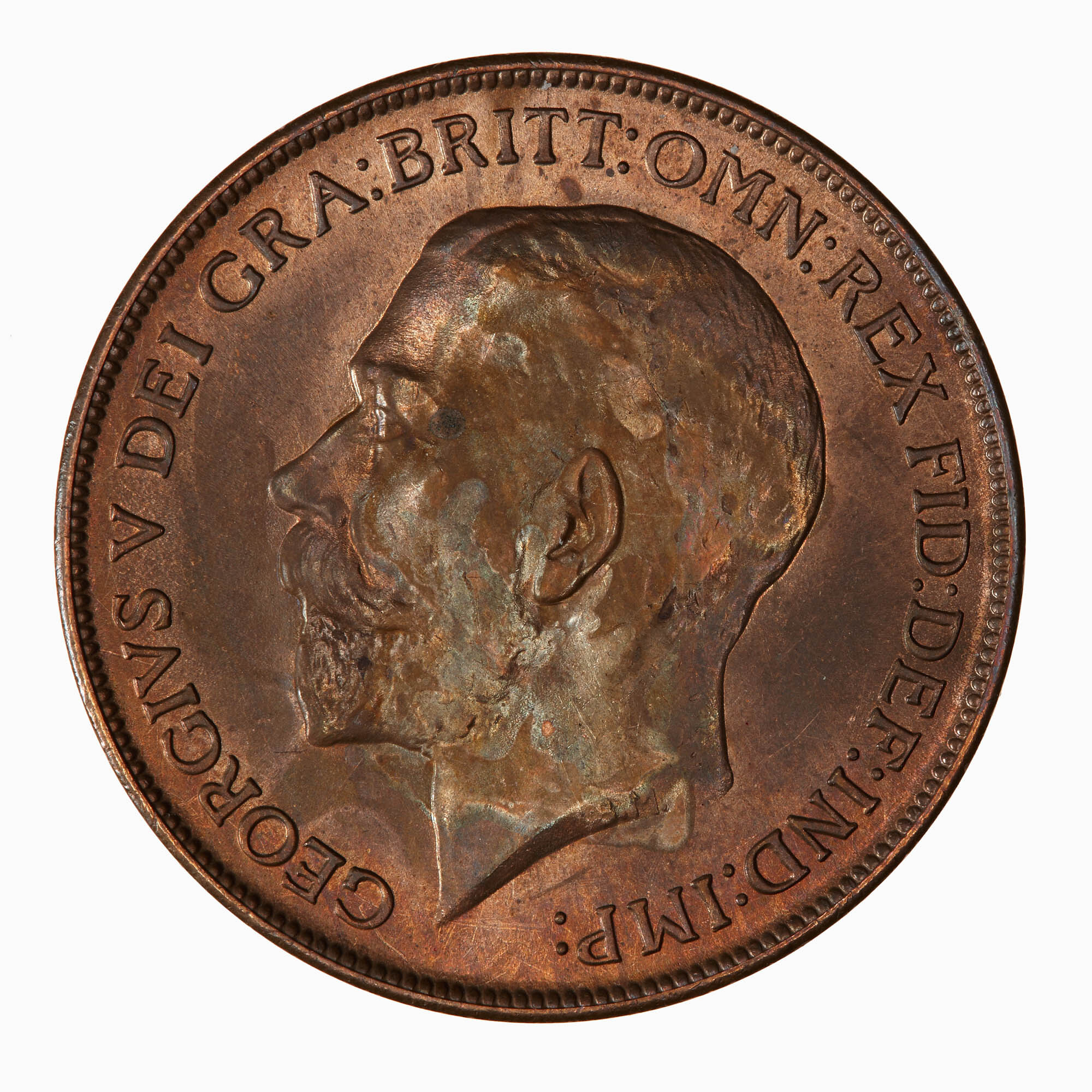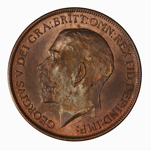 Bare head of the King facing left; below on neck truncation in small letters, B.M. (Bertram MacKennal); around, GEORGIVS V DEI GRA: BRITT: OMN: REX FID: DEF: IND: IMP:
