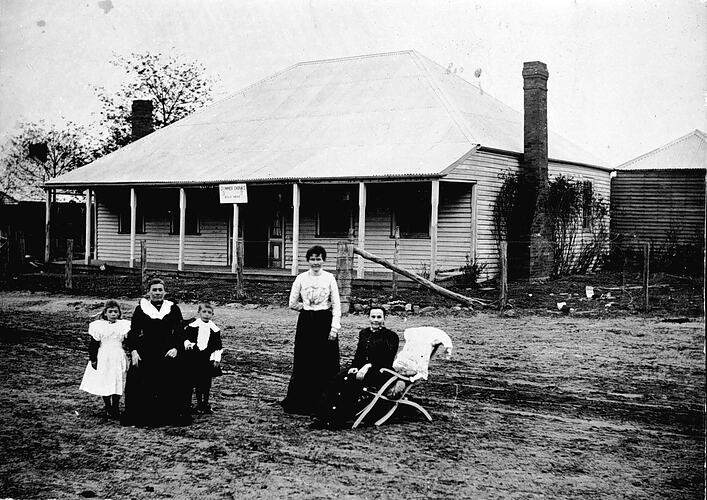 The White family in front of 'Cosmo' homestead. The homestead is weatherboard with brick chimneys and has a steep pitched roof.