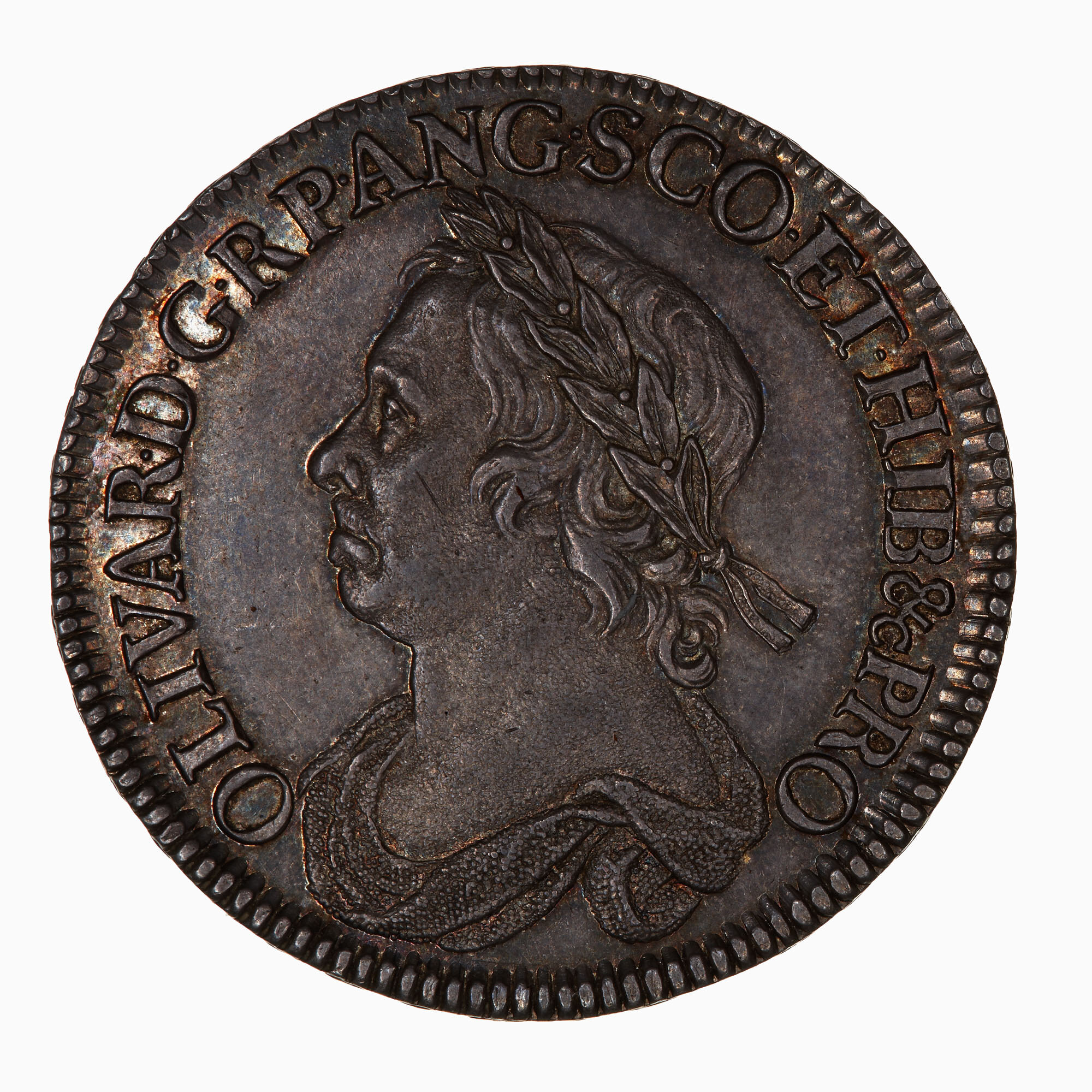 A halfcrown was a 2 shilling and 6 pence piece. Even though many circulated, the Cromwell issues are classed as patterns since they were neither tested in the trial of the pyx nor were they mentioned in the proclamation for the withdrawal of the coinage of the Commonwealth in 1661.