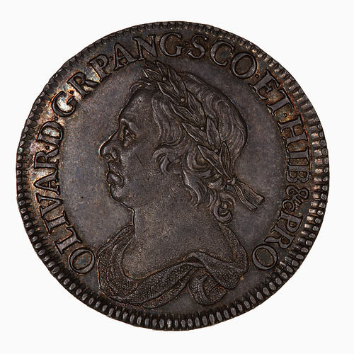 Laureate and draped bust of Cromwell facing left; around, OLIVAR D G R P ANG SCO HIB &c PRO (Translation: Oliver by the Grace of God of the Republic of England, Scotland, Ireland, etc Protector ).