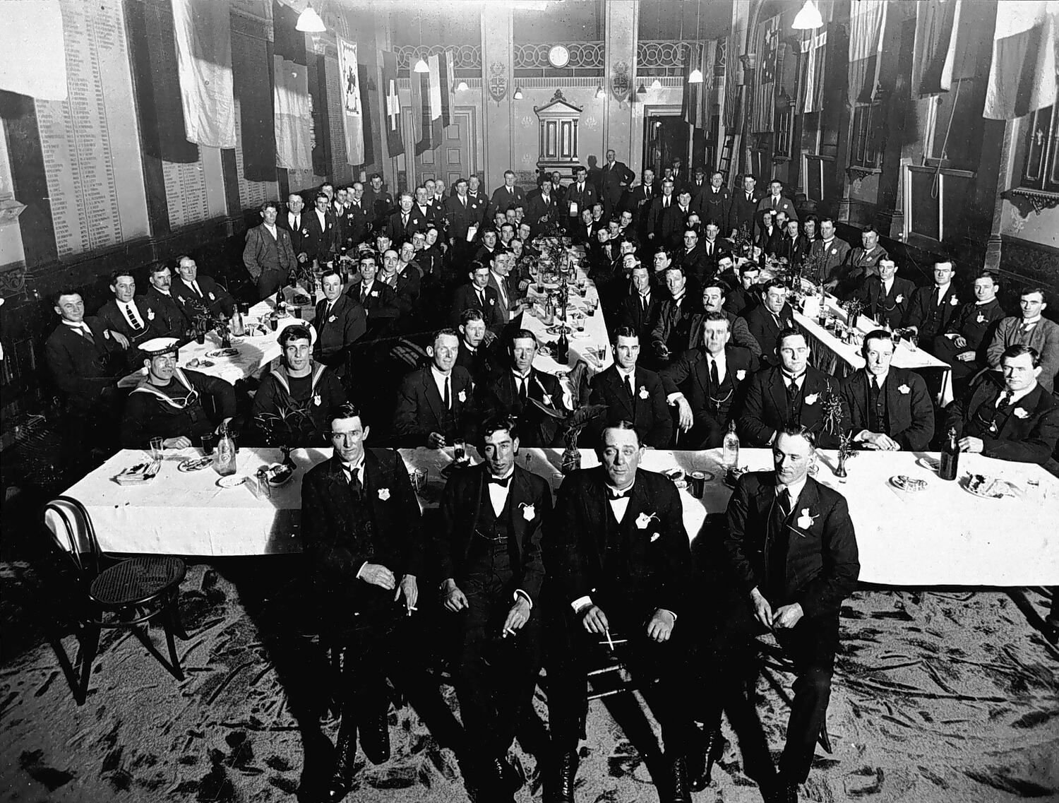 Diners at long tables, all wearing dark suits. There are two men in sailors' uniforms on the left and the hall is hung with flags.