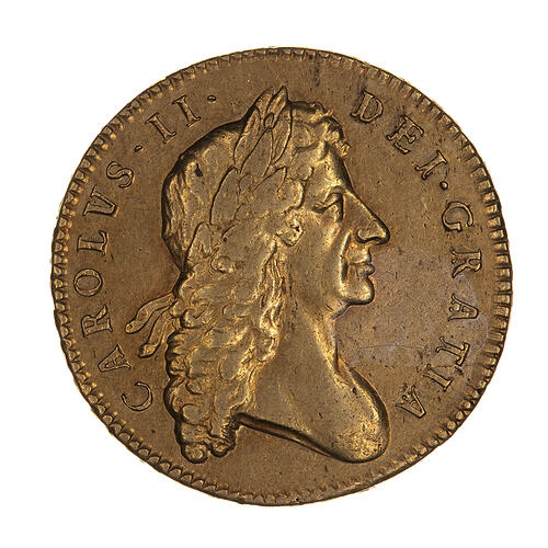 Laureate bust of Charles II facing right; around, CAROLVS . II . DEI . GRATIA