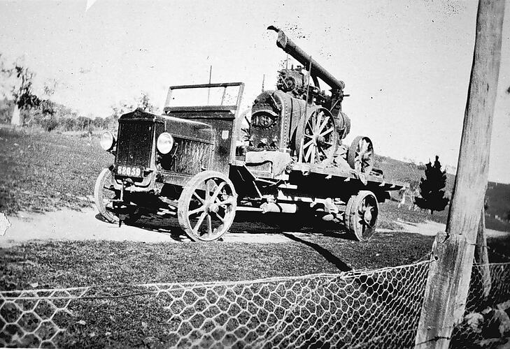 A steam engine loaded on the tray of a truck.