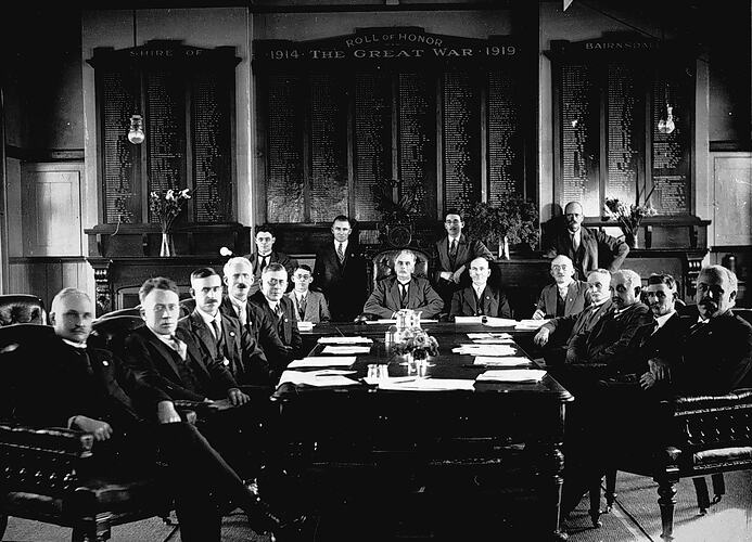 Members of the Bairnsdale Council in 1929-1930. The great war honour roll is in the background.