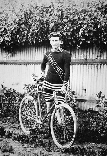 A man with a bicycle. He is in racing costume and his jersey carries the name: Massey-Harris.
