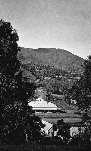 View looking down hill through trees towards the Bridge Hotel at the intersection of the Omeo Road and Dargo High Plains Road, at Dargo, Gippsland. In the background are the alluvial flats along the Dargo River, and in the foreground at the bottom of the hill there are two horses in a yard at the back of the Police Station. This photograph was possibly taken at the same time as MM 7801, which shows a similar view. The sign above the verandah on the corner of the building reads 'BRIDGE HOTEL'.