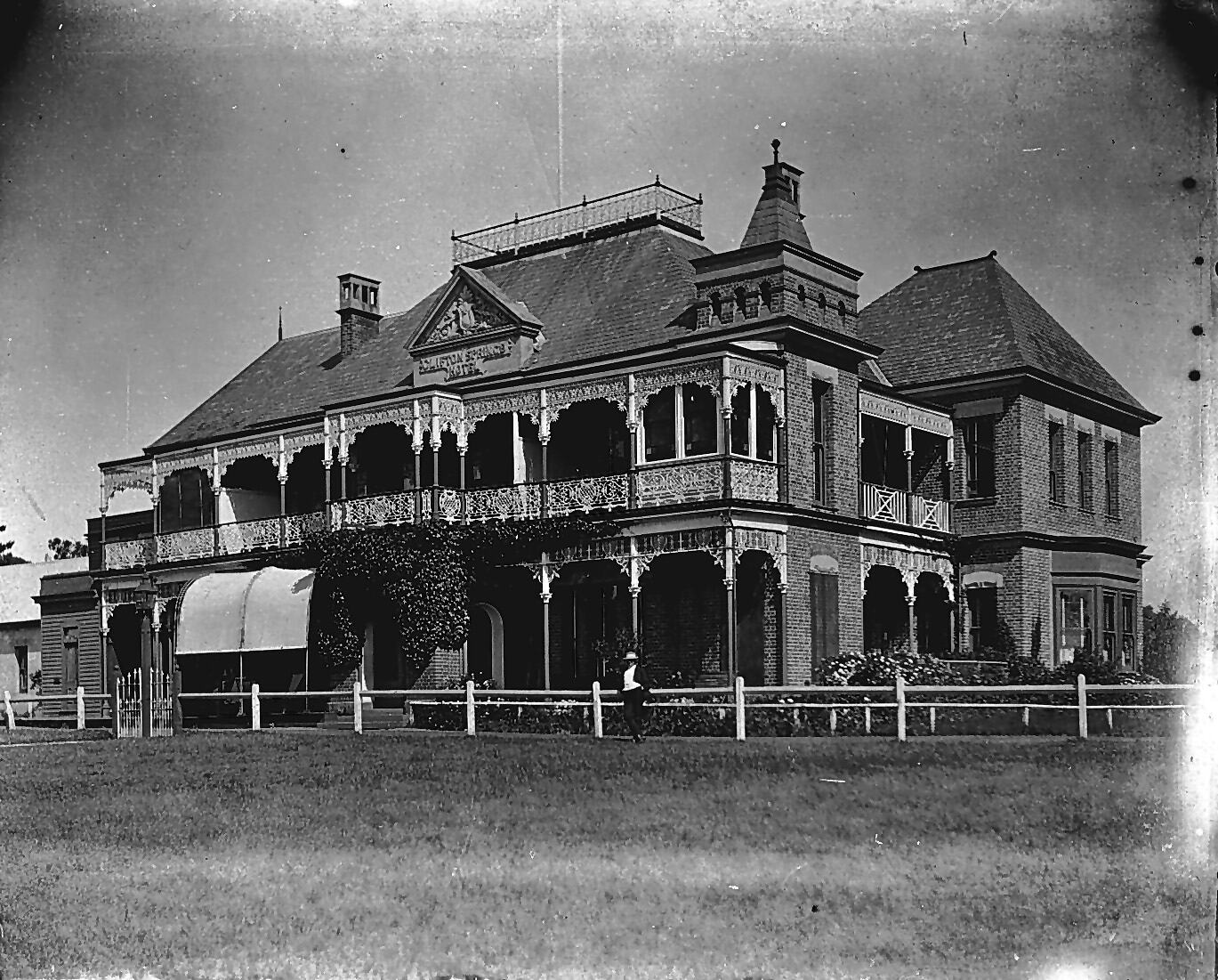 The Clifton Springs Hotel. There is iron lacework on the verandas and a promenade on the roof.