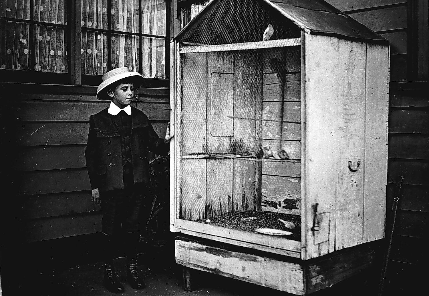 A boy with a large bird cage. There are birds inside the cage.