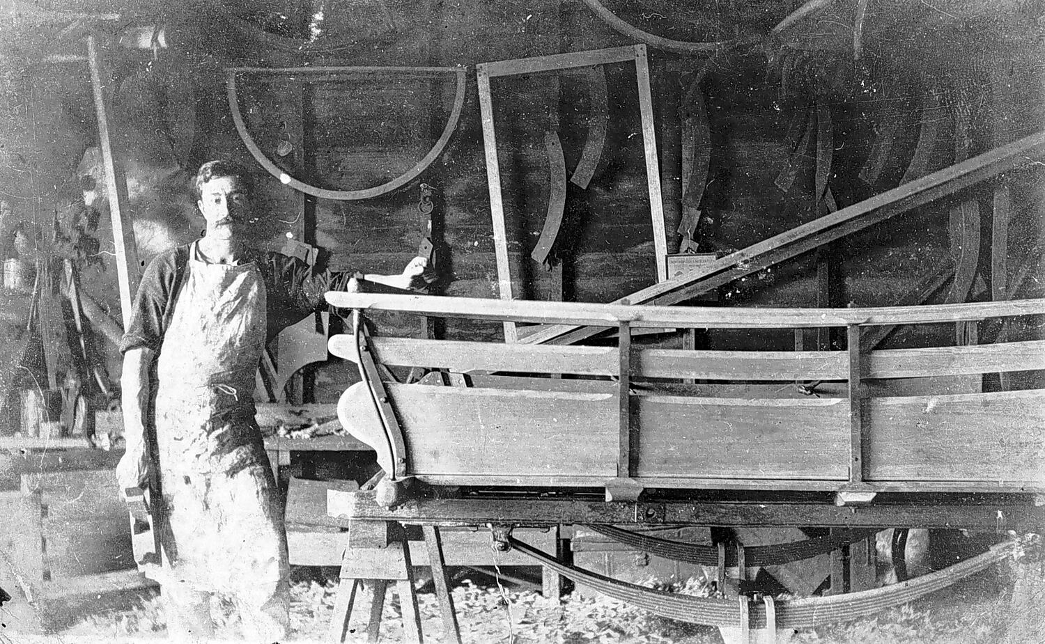 A man with a carriage which is under construction. He holds an plane his hand and there are various forms hanging on the wall behind him.